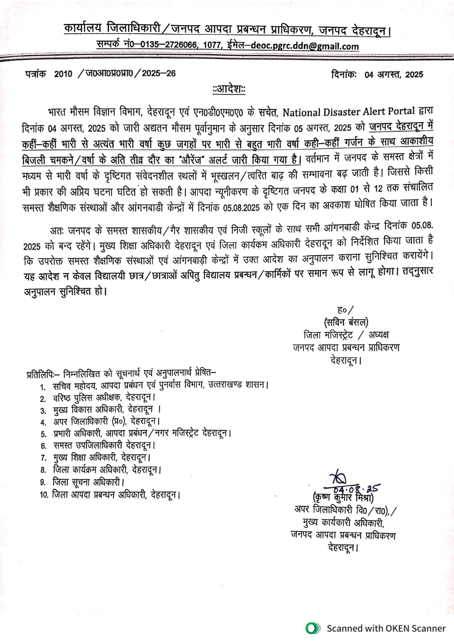 इसके मद्देनज़र, देहरादून ज़िले में संचालित सभी शिक्षण संस्थानों और आंगनबाड़ी केंद्रों में 5 अगस्त को अवकाश घोषित किया गया है।