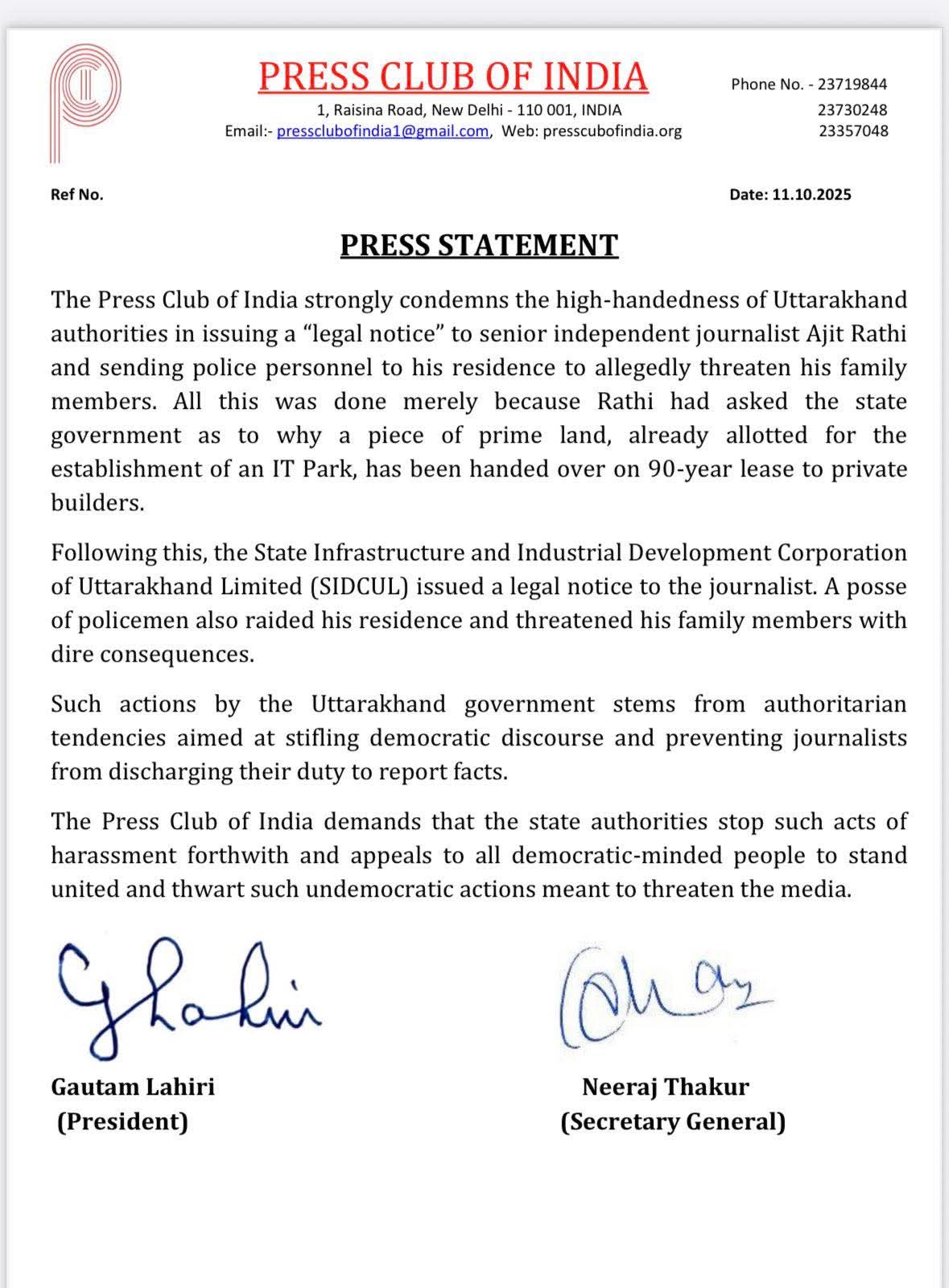 उधर, प्रेस क्लब ऑफ उत्तराखंड ने भी एक सशक्त बयान जारी करते हुए कहा —
