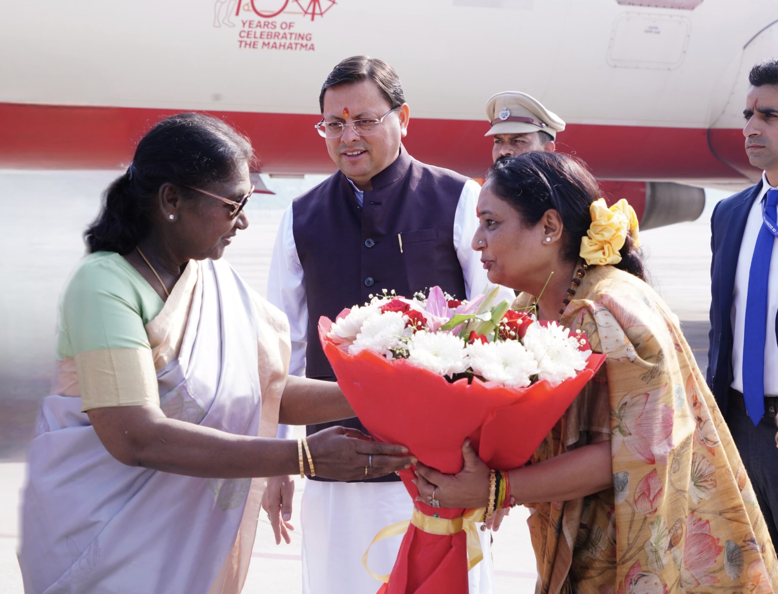उत्तराखंड में आज राष्ट्रपति द्रौपदी मुर्मु के स्वागत में गर्मजोशी और गर्व का माहौल देखने को मिला। राष्ट्रपति के जौलीग्रांट एयरपोर्ट पहुंचने पर राज्यपाल लेफ्टिनेंट जनरल गुरमीत सिंह (से नि), मुख्यमंत्री पुष्कर सिंह धामी, विधानसभा अध्यक्ष ऋतु खंडूड़ी भूषण, कैबिनेट मंत्री, विधायकगण और वरिष्ठ अधिकारी उपस्थित रहे। एयरपोर्ट परिसर में पारंपरिक ढोल-दमाऊ और फूलों की वर्षा के बीच राष्ट्रपति का अभिनंदन किया गया।