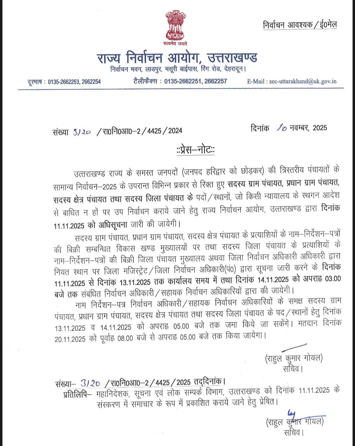 рдЙрддреНрддрд░рд╛рдЦрдВрдб рд░рд╛рдЬреНрдп рдирд┐рд░реНрд╡рд╛рдЪрди рдЖрдпреЛрдЧ рдиреЗ рддреНрд░рд┐рд╕реНрддрд░реАрдп рдкрдВрдЪрд╛рдпрддреЛрдВ рдХреЗ рд░рд┐рдХреНрдд рдкрдбрд╝реЗ рдкрджреЛрдВ рдкрд░ рдЙрдк-рдЪреБрдирд╛рд╡ рдХреА рдФрдкрдЪрд╛рд░рд┐рдХ рдШреЛрд╖рдгрд╛ рдХрд░ рджреА рд╣реИред рд╣рд░рд┐рджреНрд╡рд╛рд░ рдЬрд┐рд▓реЗ рдХреЛ рдЫреЛрдбрд╝рдХрд░ рд░рд╛рдЬреНрдп рдХреЗ рд╕рднреА рдЬрдирдкрджреЛрдВ рдореЗрдВ рдпрд╣ рдЙрдк-рдЪреБрдирд╛рд╡ рд╣реЛрдВрдЧреЗред рдЗрдирдореЗрдВ рдЧреНрд░рд╛рдо рдкрдВрдЪрд╛рдпрдд рд╕рджрд╕реНрдп, рдЧреНрд░рд╛рдо рдкреНрд░рдзрд╛рди, рдХреНрд╖реЗрддреНрд░ рдкрдВрдЪрд╛рдпрдд рд╕рджрд╕реНрдп рдФрд░ рдЬрд┐рд▓рд╛ рдкрдВрдЪрд╛рдпрдд рд╕рджрд╕реНрдп рдХреЗ рдкрдж рд╢рд╛рдорд┐рд▓ рд╣реИрдВред